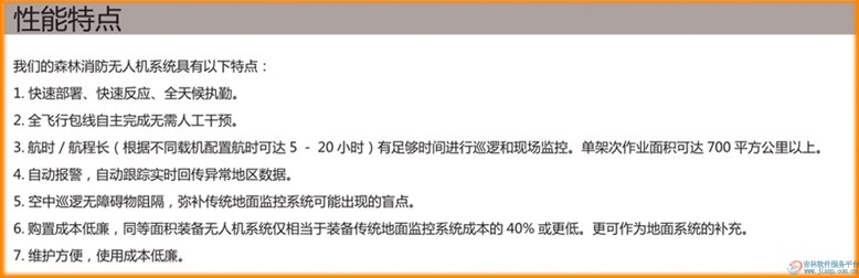 该无人机系统有效的解决了当前小型遥感无人机的持续飞行距离和飞行测控、保障方面的技术问题;同时解决了遥感影像实时传输、远距离传输和高分辨率图像数据传输等技术难题。远距离实时宽带数据传输中型无人机系统具有机动、快速、经济等优势,具有续航时间长、影像实时传输、高危地区探测、成本低、机动灵活等特点。